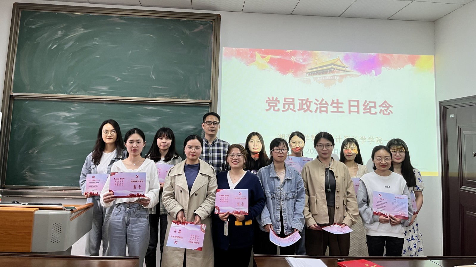 党员政治生日纪念环节,田坤和学生党支部支委为5月过政治生日的党员送上定制的政治生日贺卡和诚挚的问候;随后全体党员面向党旗重温入党誓词。小小的贺卡和庄严的誓词,勉励毕业生党员牢记党的宗旨和党员身份。