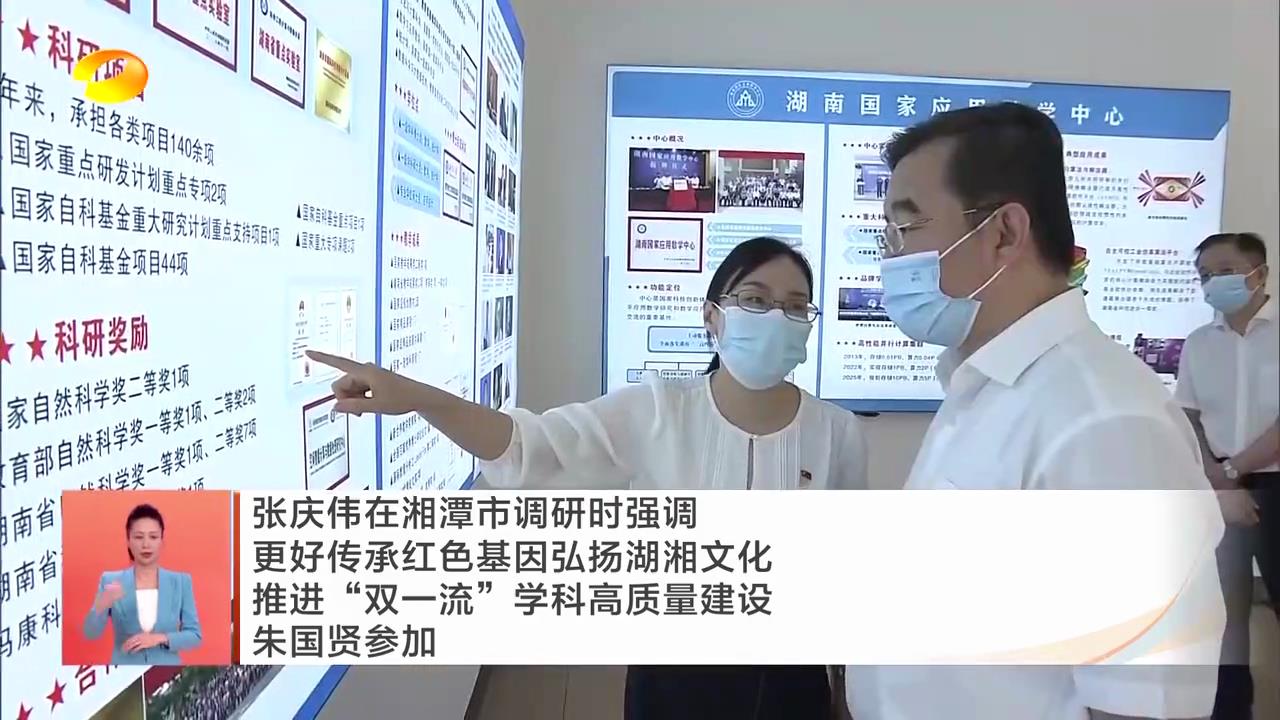 9月28日上午,省委书记、省人大常委会主任张庆伟在湘潭市调研“双一流”学科建设、湖湘文化保护和传承等工作。他强调,要深入学习贯彻习近平总书记对湖南重要讲话重要指示批示精神,始终牢记习近平总书记对办好湘潭大学提出的殷切期望,传承红色基因,全力推进“双一流”学科高质量建设,为建设现代化新湖南作出新贡献,以实际行动迎接党的二十大胜利召开。省委副书记朱国贤参加。