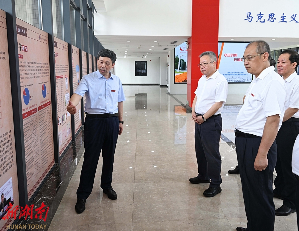 湘潭大学校史馆里,丰富的图片和档案史料生动展现了学校60多年来的发展历程。沈晓明边看边听讲解,详细了解学校建设发展、教学科研、人才培养等情况,对办学成效表示肯定。他说,要不忘初心、牢记使命,坚持为党育人、为国育才,在更高起点上谋划推动学校发展,为助力实现“三高四新”美好蓝图作出更大贡献。