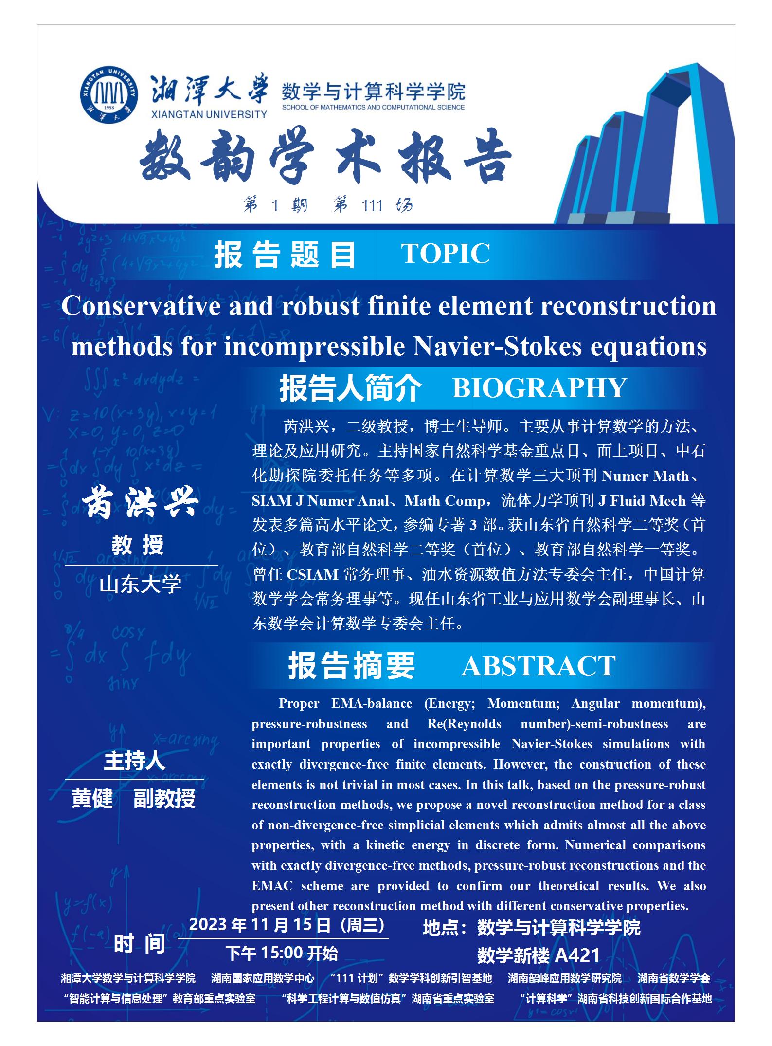 数韵学术报告-Conservative and robust finite element reconstruction methods for incompressible Navier-Stokes equations