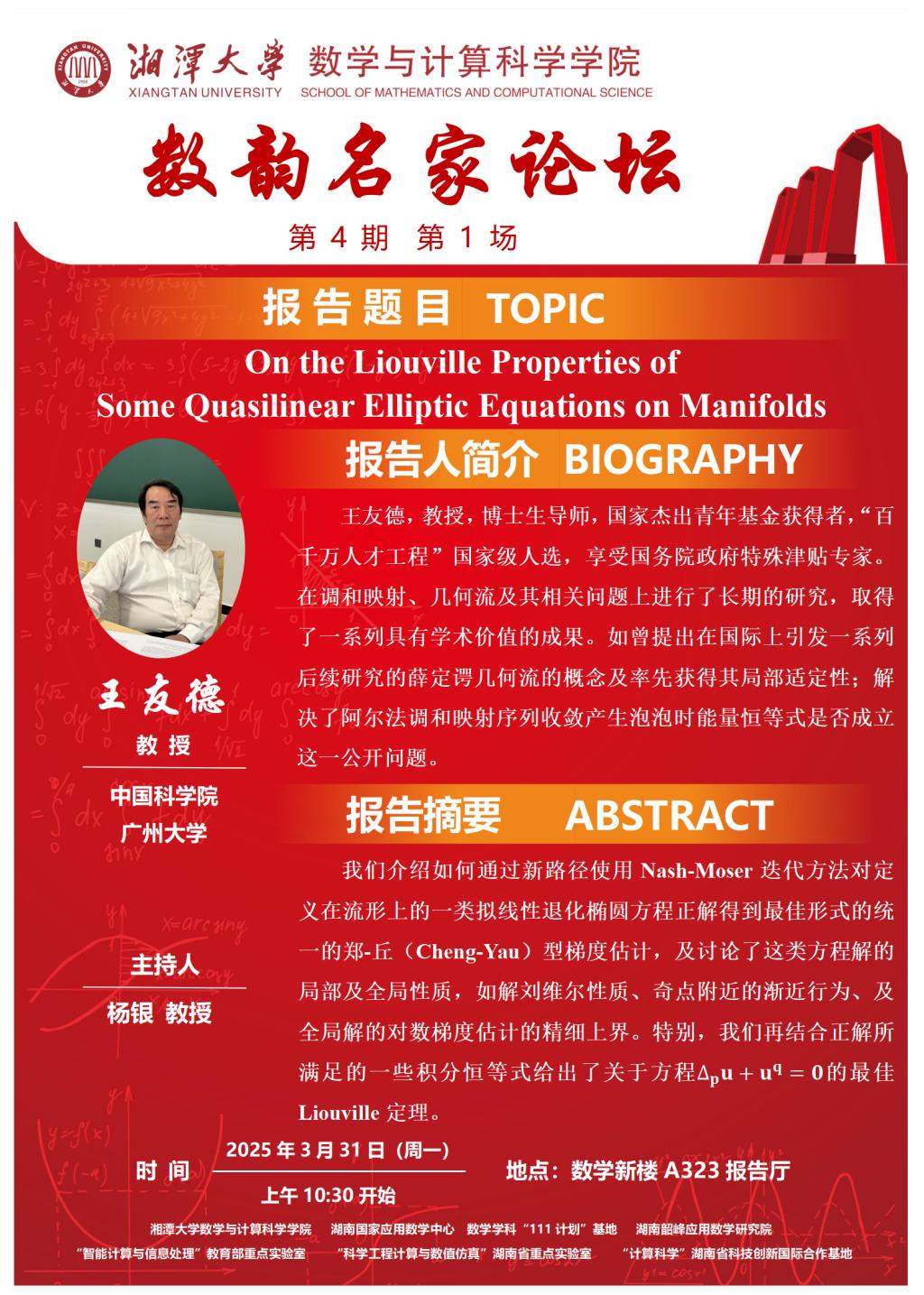 数韵名家论坛-On the Liouville Properties of Some Quasilinear Elliptic Equations on Manifolds