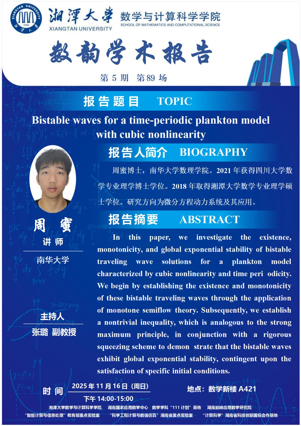 数韵学术报告-Bistable waves for a time-periodic plankton model with cubic nonlinearity