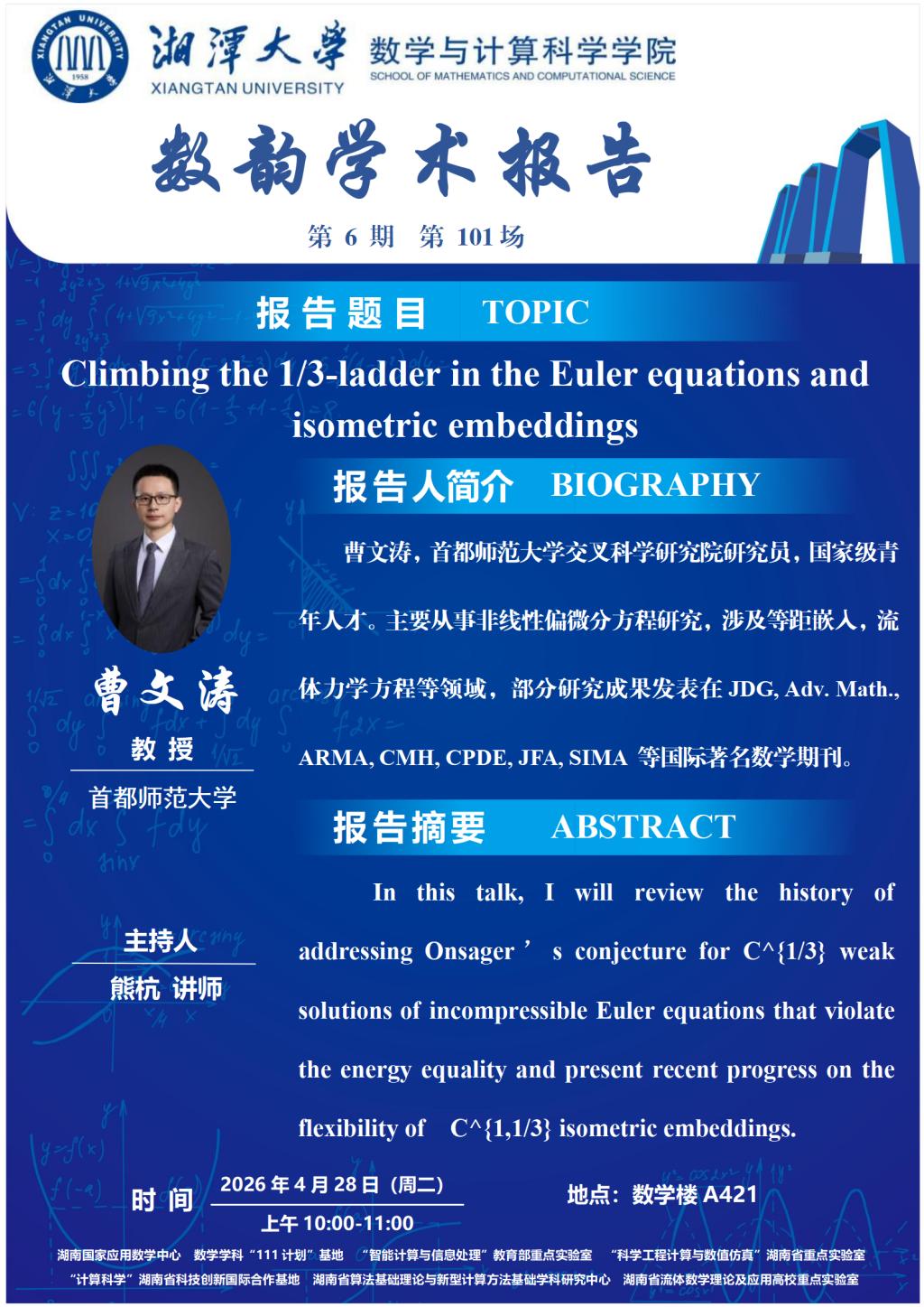 数韵学术报告—曹文涛—Climbing the 1/3-ladder in the Euler equations and isometric embeddings