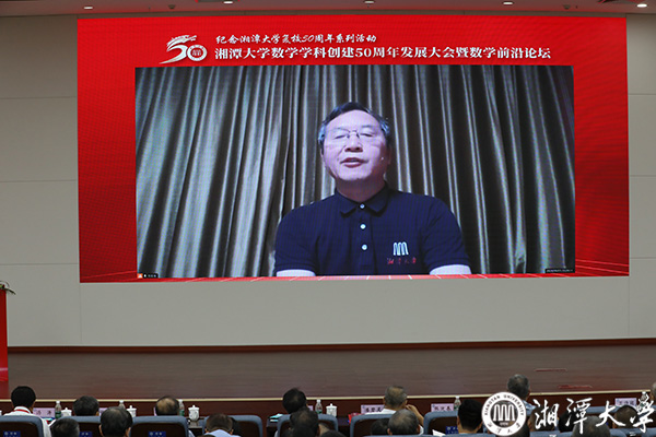 大会组委会代表、校友袁亚湘院士线上参会。他说,50年来,湘大数学学科在人才培养、科学研究等方面取得了一定成绩,归功于数学学科老师的辛勤付出,数学界各学术团体、数学同仁的关心支持,以及国家自然科学基金委等的资助。借此机会,向数学学科50华诞表达祝福,向与会代表致以诚挚感谢。